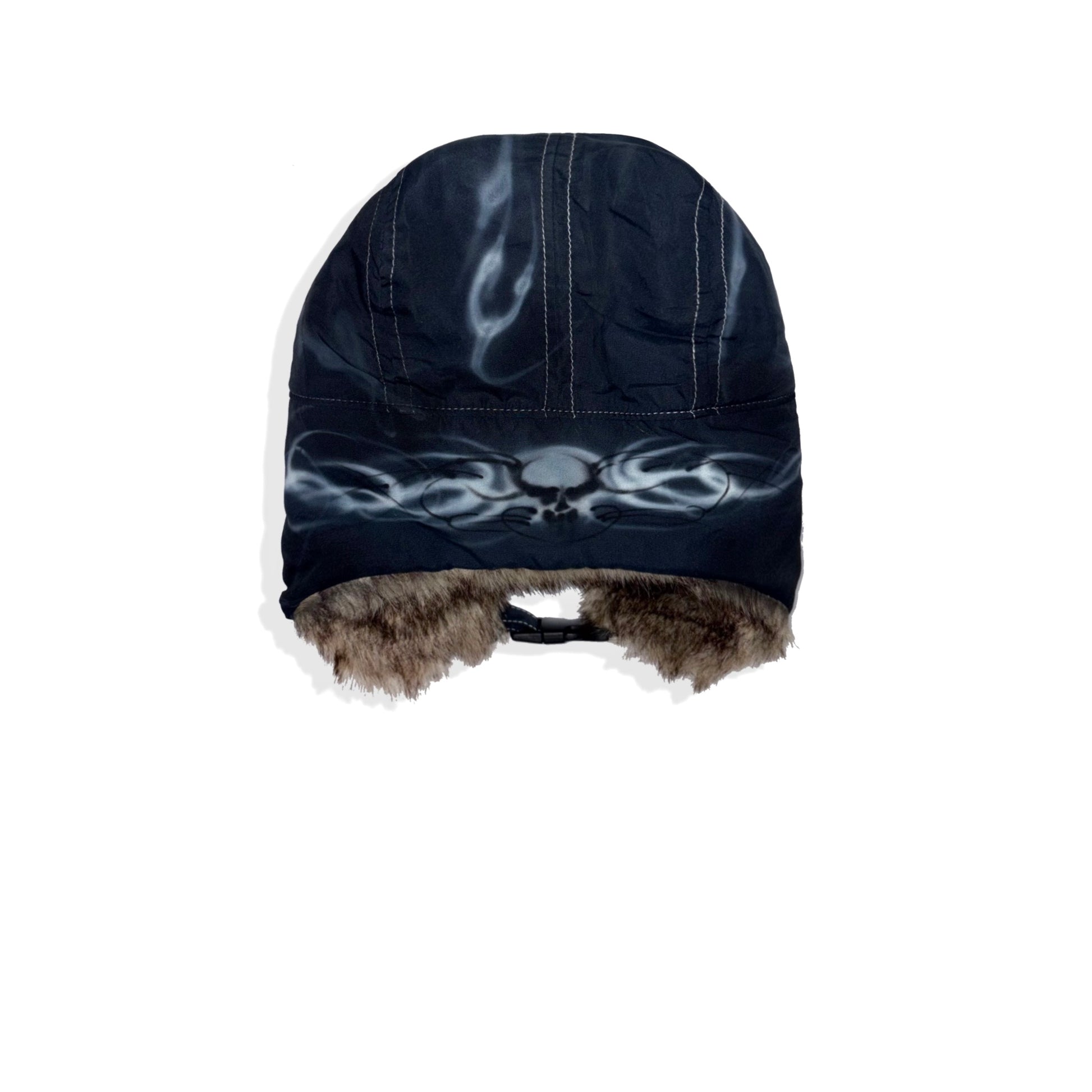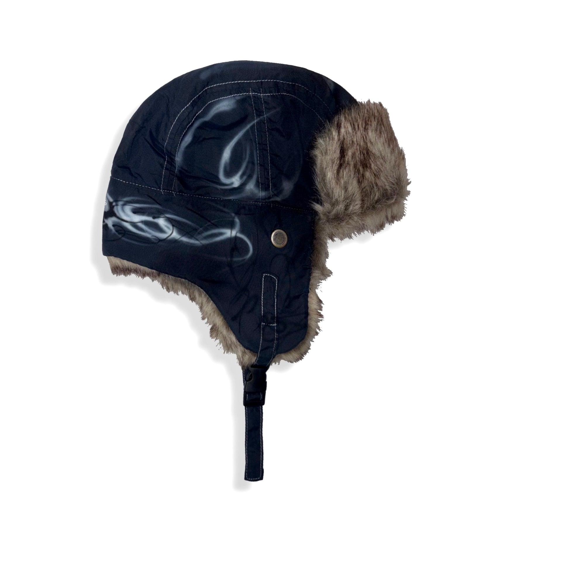 1/1 airbrushed trapper hat. Faux fur trim.