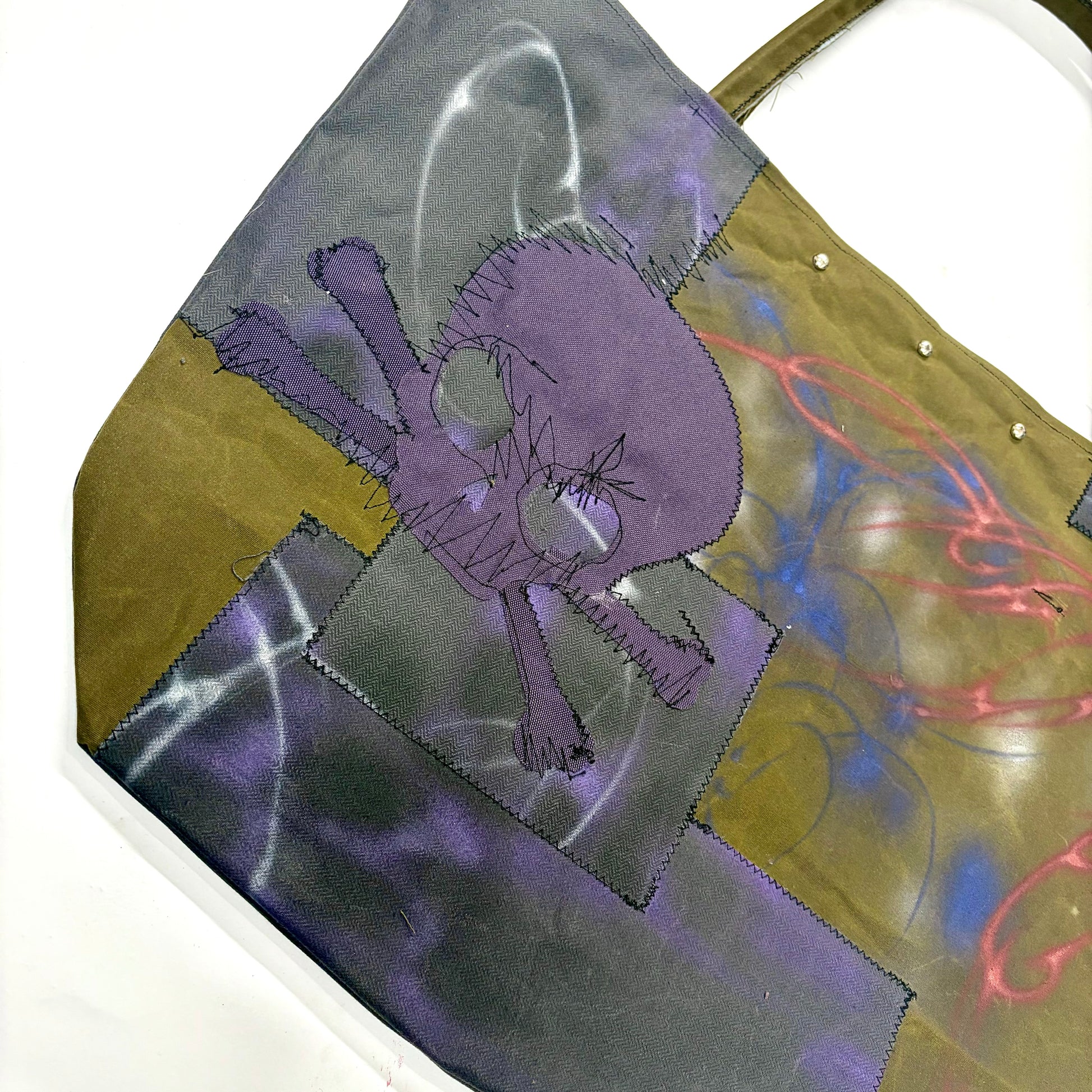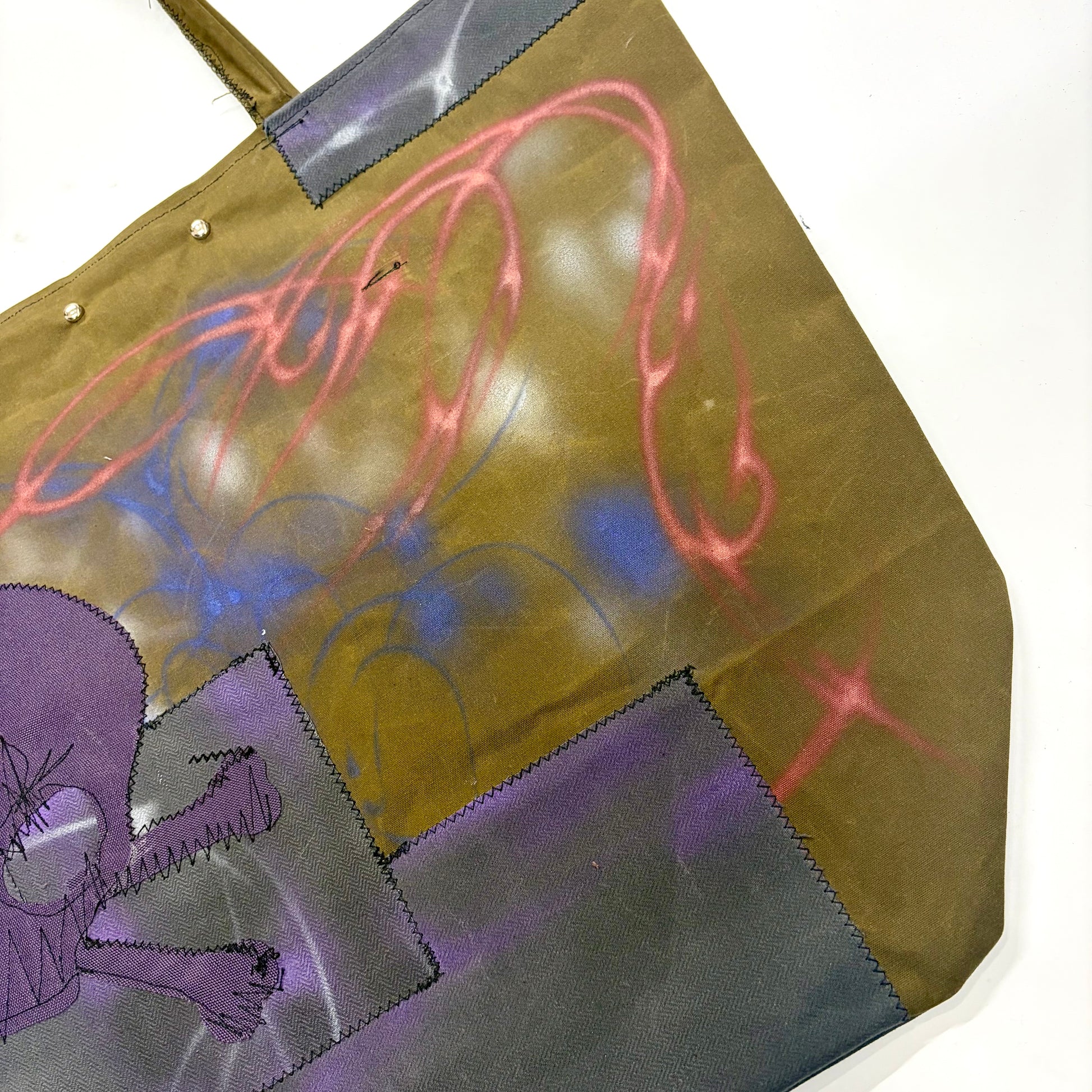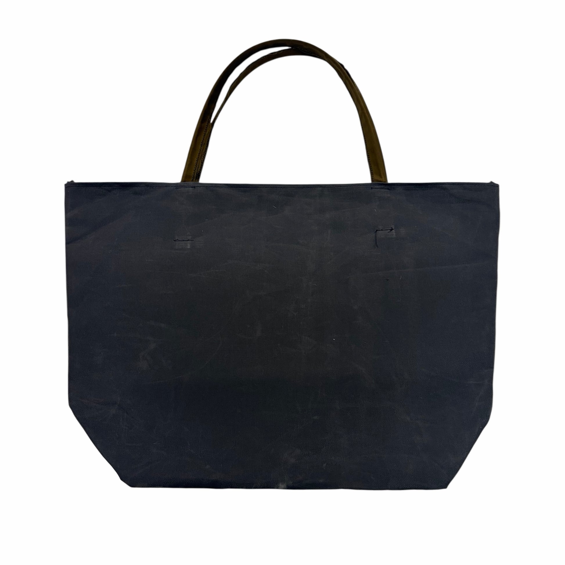 1/1 tote bag. Large capacity - fits lots of things in it. Cut and sewn in studio in London. Combination of surplus and scrap fabrics, mostly cotton and waxed canvas.