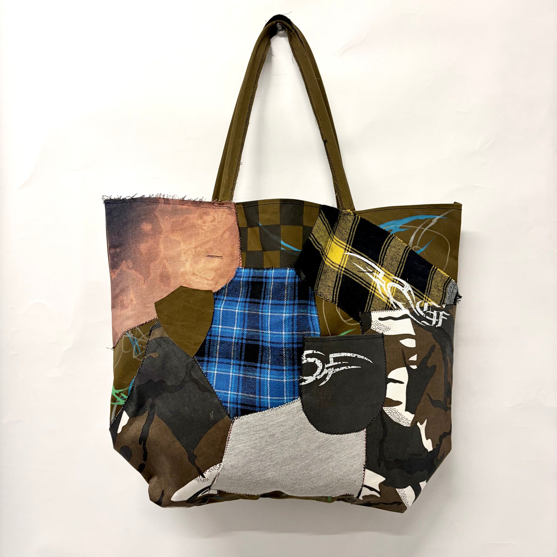 1/1 tote bag. Large capacity, fits lots of things in it. Made up of various scrap and surplus fabrics. Cut and sewn in the studio. Extra special piece!