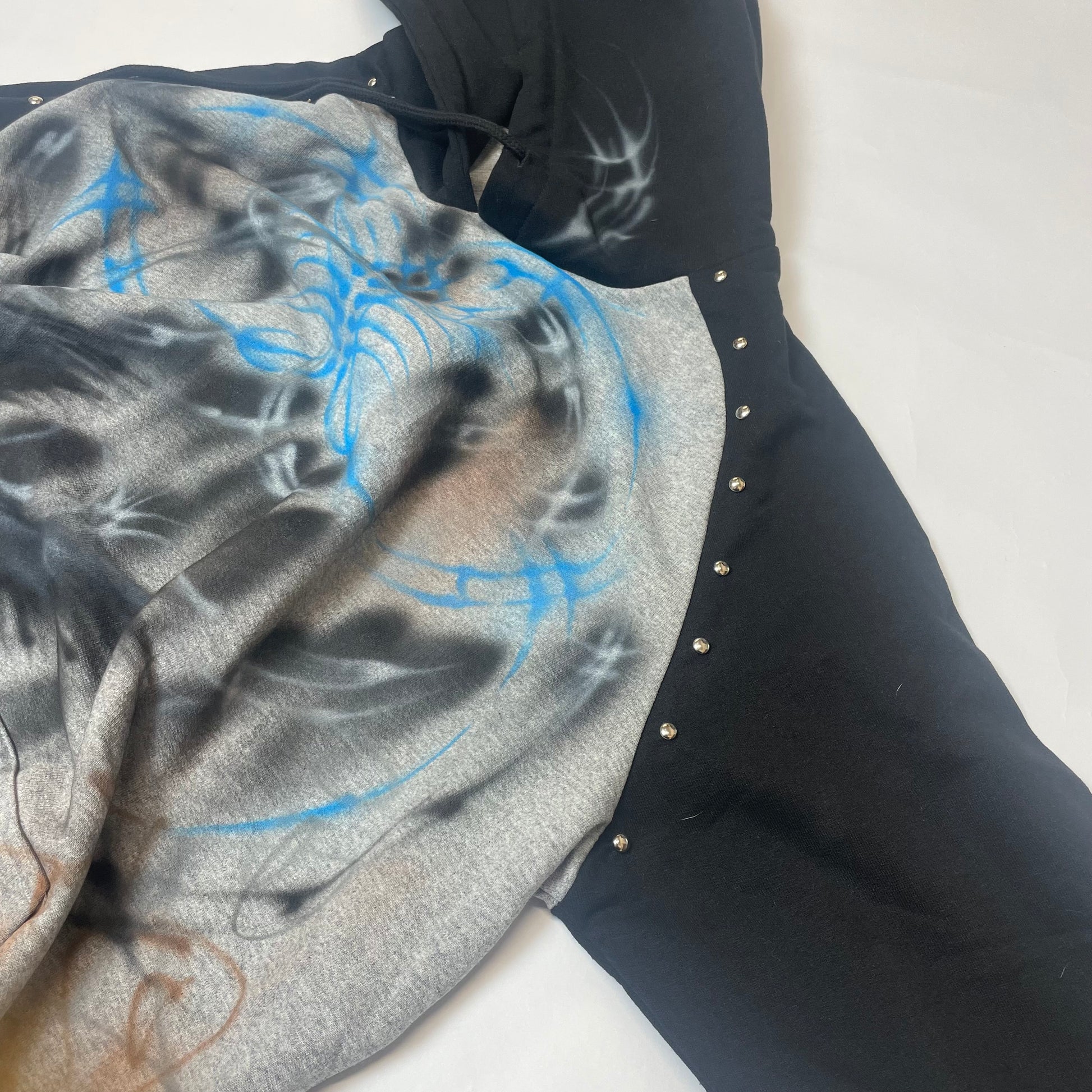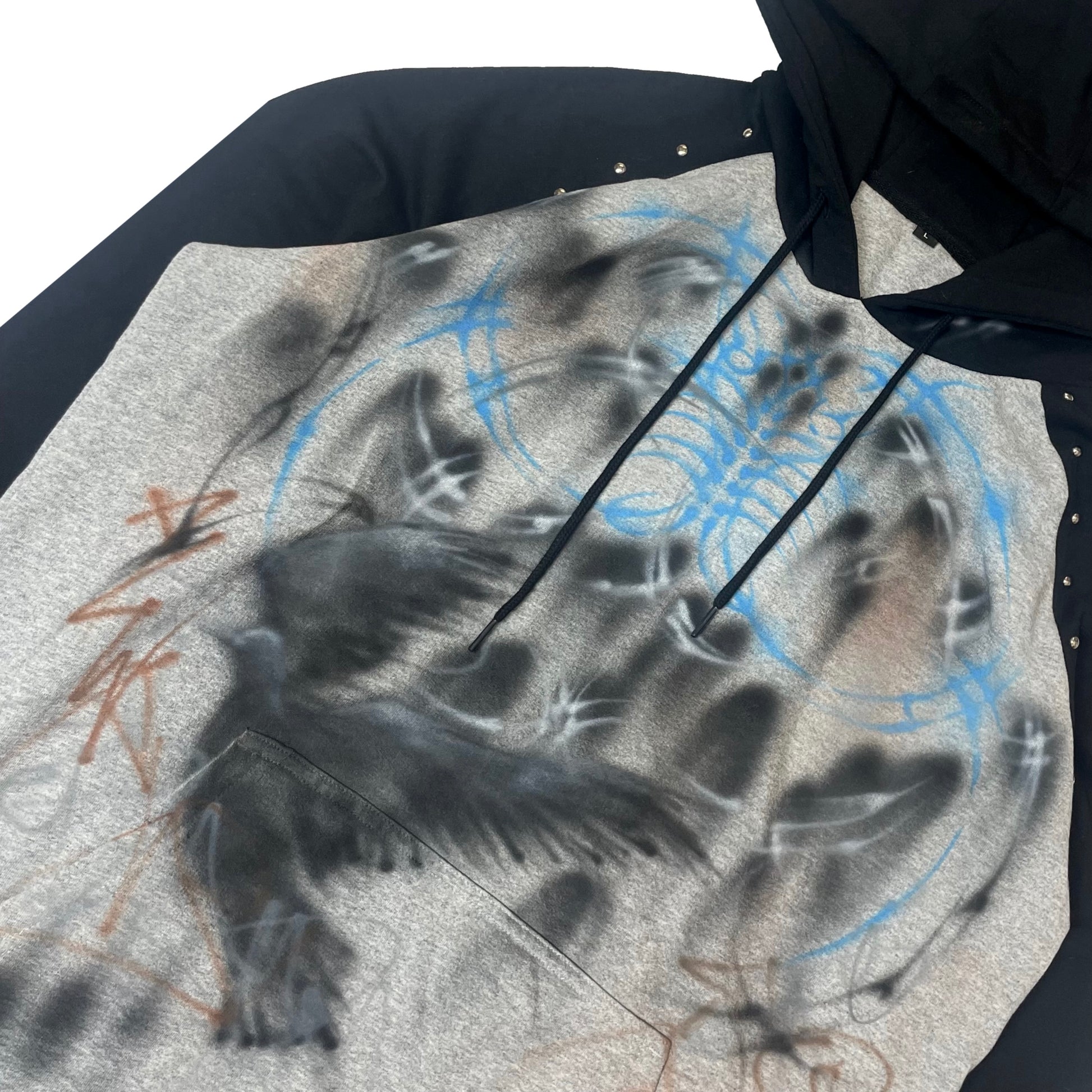 1/1 airbrushed raglan sleeve cotton hoodie. Studded along arm seams. fits size L.