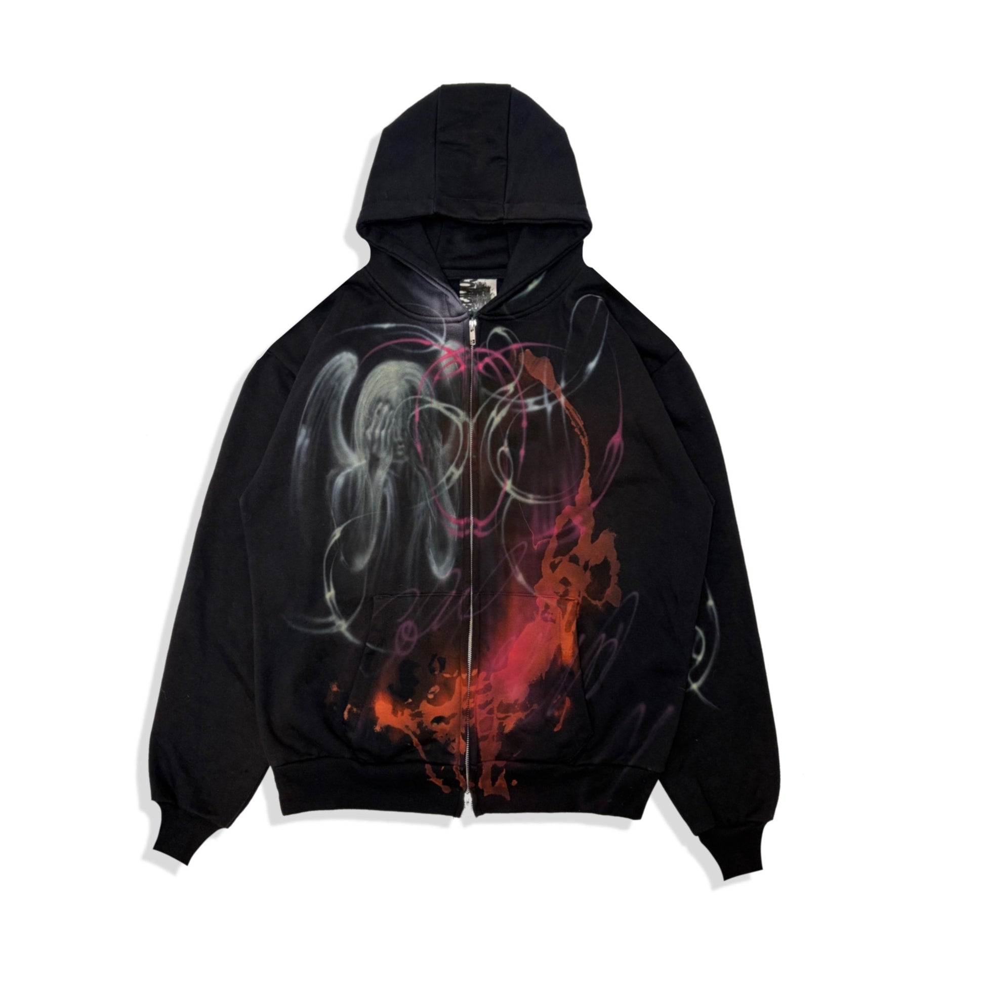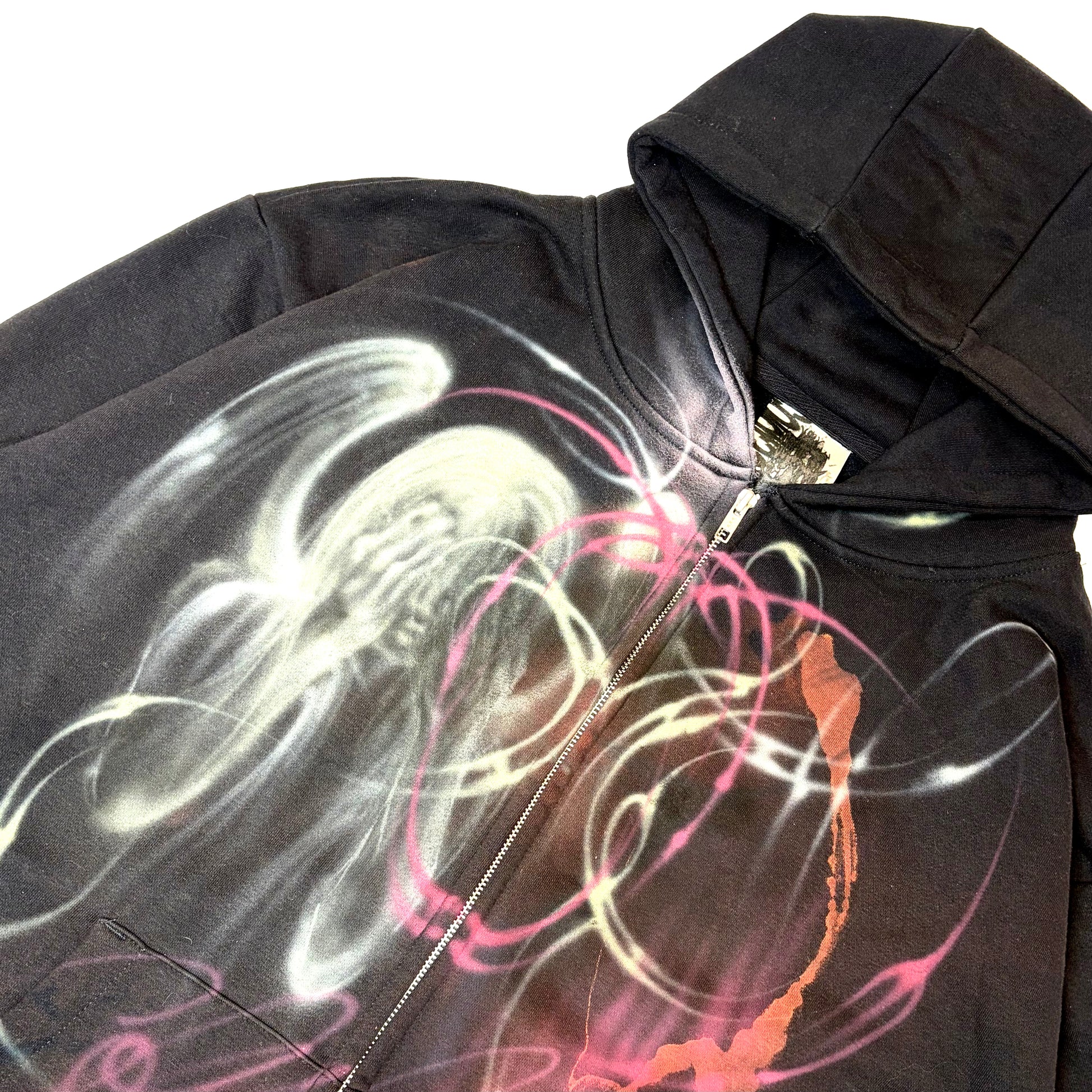 1/1 bleached + airbrushed zip hoodie. Heavyweight cotton. two way zip. fits L/xl.
